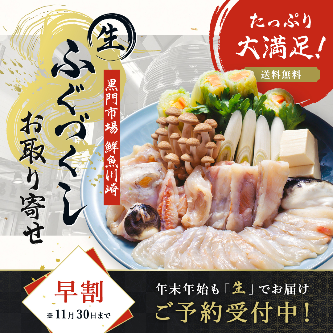 すべて表示 最近の魚達 魚のうんちく 業界情報 店舗情報 ピックアップ一覧 店舗情報 FAQ..大雪や台風・地震などの災害時で荷物の配送が遅れる場合は、連絡はもらえますか? 2025.12.16 最近の魚達 ’天然とらふぐ‘入荷しました! 2025.12.08 店舗情報 12月(特に年末)の配送遅配にご注意ください。 2025.12.08 店舗情報 ’ふぐづくし白子セット’の白子に関しまして。 2025.11.08 最近の魚達 松葉ガニ解禁です! 2025.11.05 店舗情報 鮮魚川崎”ふぐづくしお取り寄せ ”2025年販売開始!”早割特価で年末年始の予約受付中” 2025.11.01 店舗情報 ”2025年11月1日より販売開始 ”鮮魚川崎”ふぐづくしお取り寄せ 2025.10.29 最近の魚達 ’活け車海老’泳いでます! 2025.10.01 最近の魚達 伊勢海老が解禁です! 2025.10.01 店舗情報 お盆休みのお知らせ 2025.07.23 最近の魚達 丑の日(7月19日)ご予約お早めに。 2025.07.02 最近の魚達 今年も’はもづくし’お取り寄せ始まりました。 2025.05.19